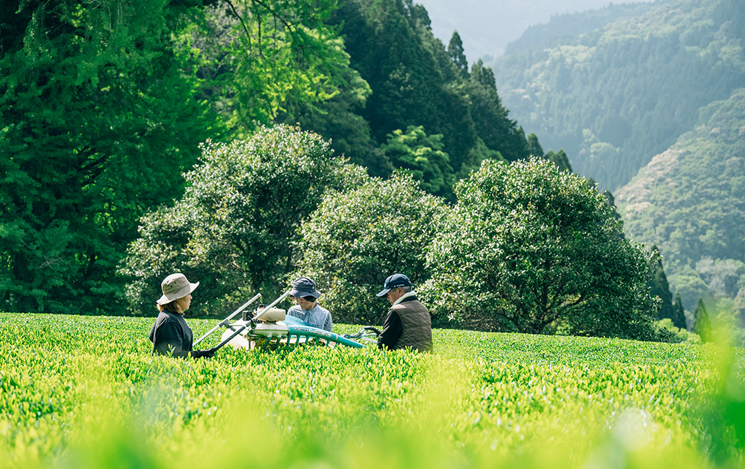 私たちの茶畑は、標高400~700mほどの比較的高いところにあります。九州地方の温暖な気候に、山地ならではの寒暖差と霧は、茶葉の苦みやえぐみを抑え、香りと甘みを引き出すのに絶好の条件。澄んだ空気と抜群の水質も合わさった、茶葉に負担の少ない環境です。